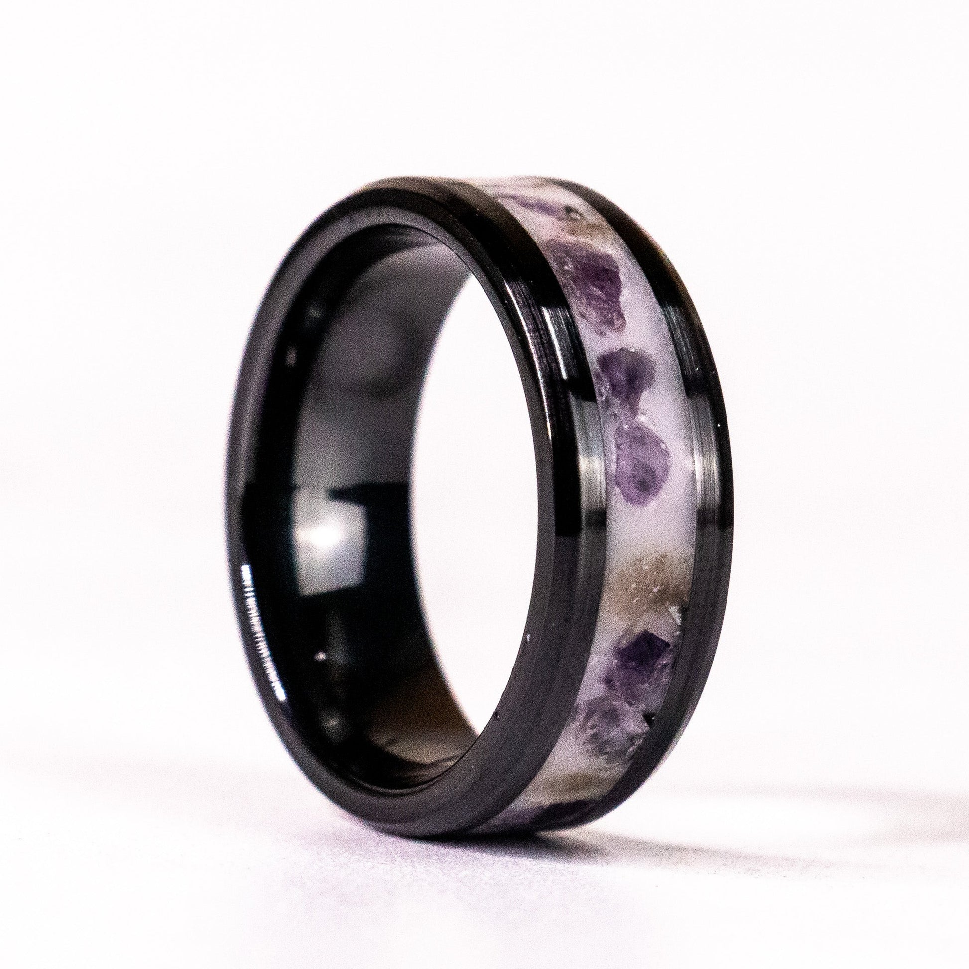 Amethyst is known to promote positive energy. We inlaid it into hypoallergenic black ceramic with our deep indigo purple glow. Purple on Black is gorgeous. You're welcome to choose your own glow color to make this ring any way you'd like.