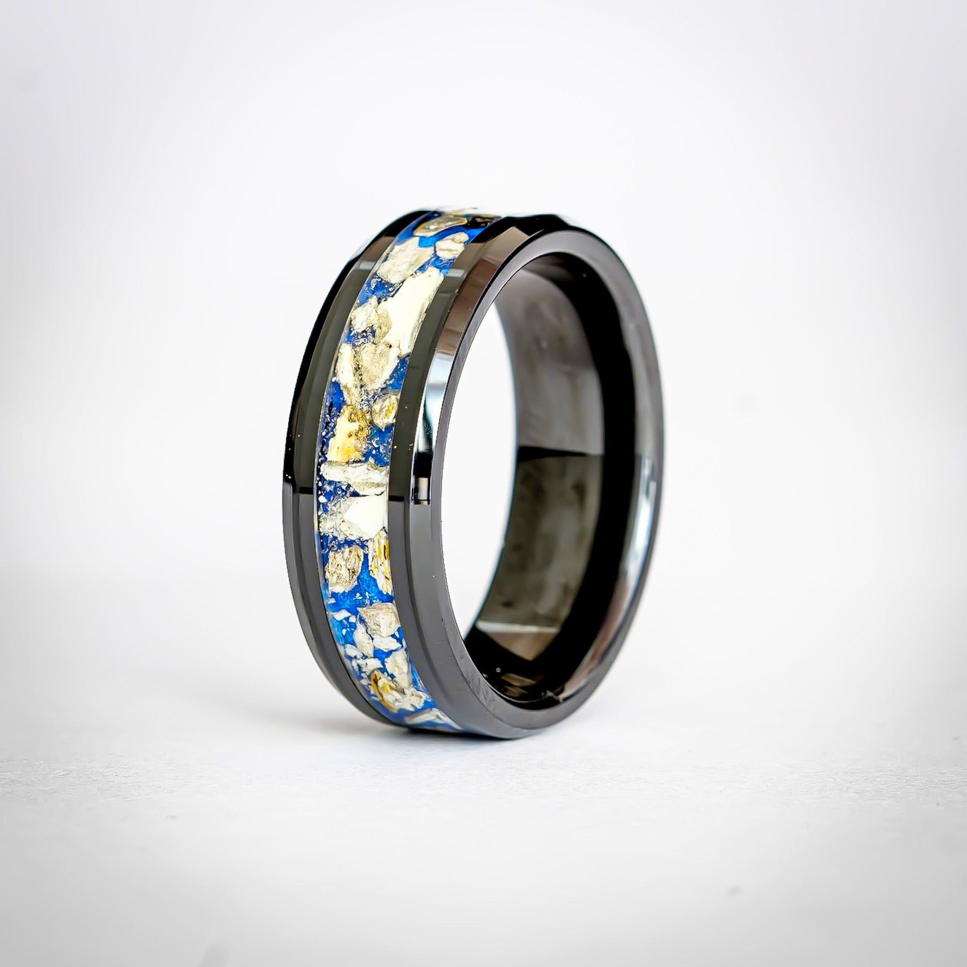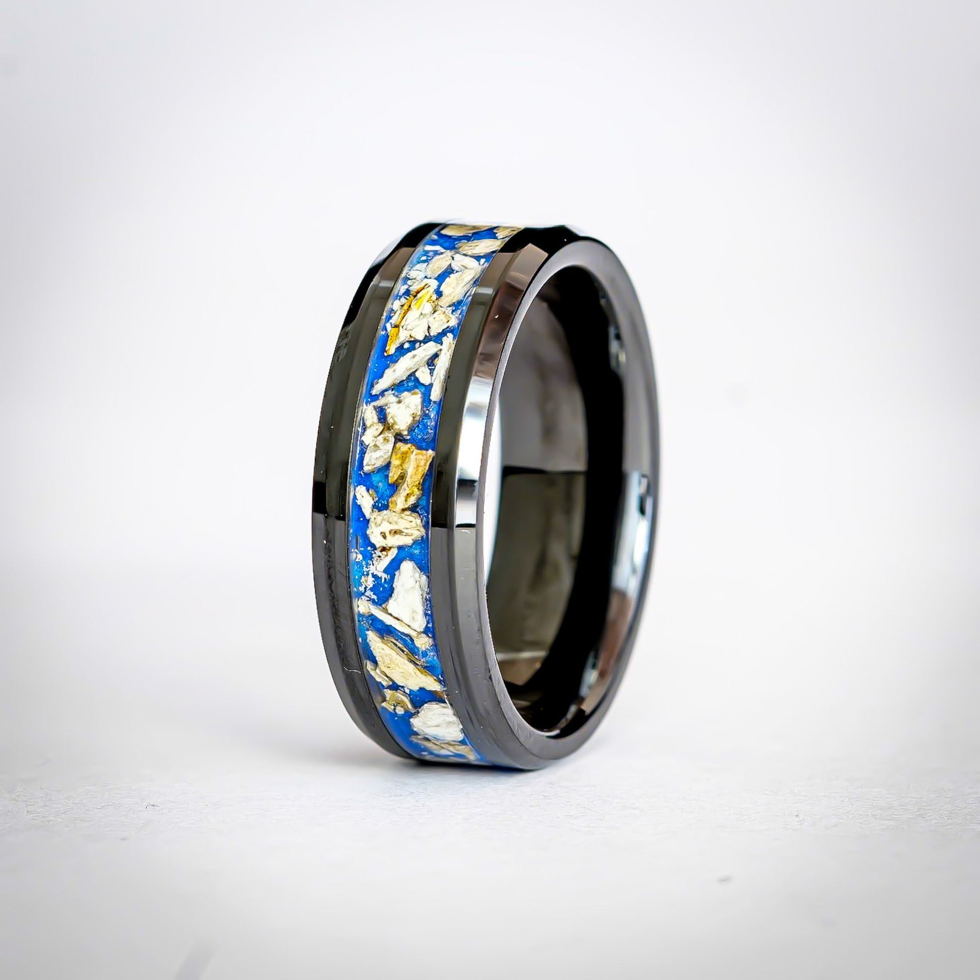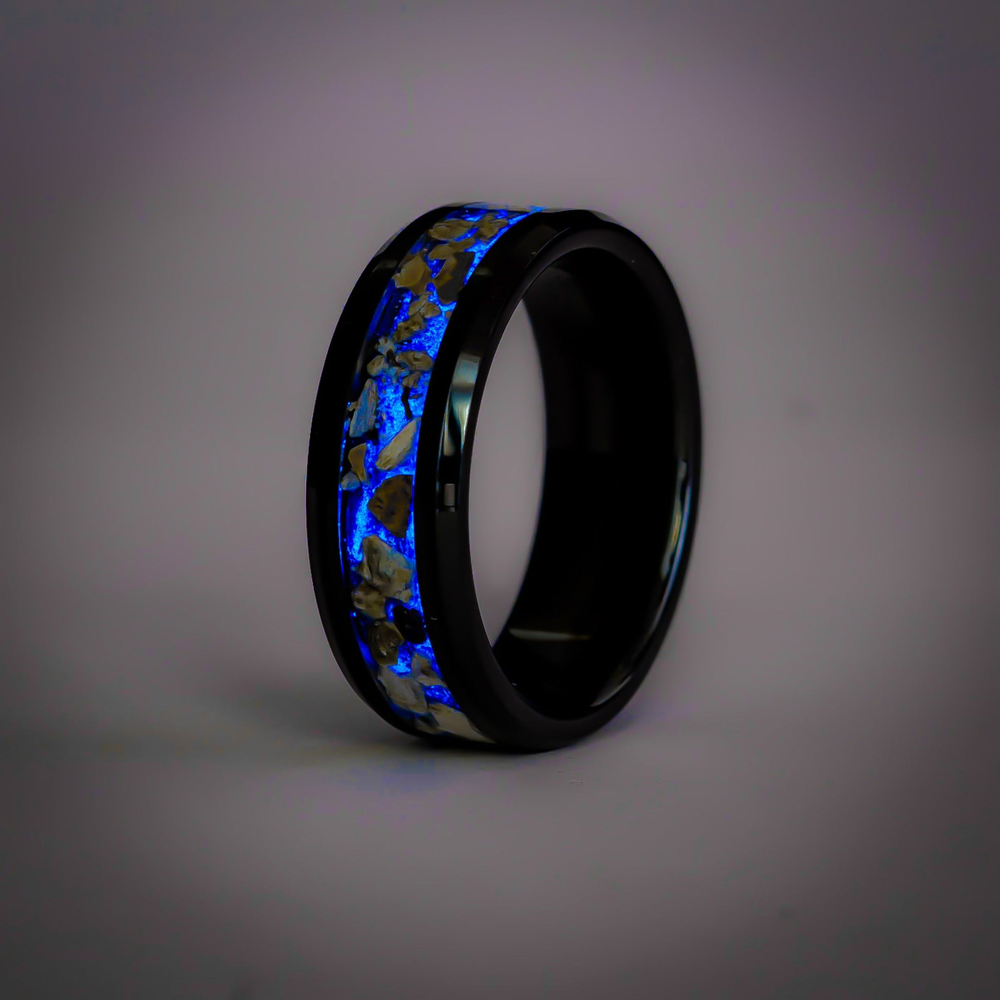 The Blue Mammoth ring is expertly crafted with genuine mammoth bone and tooth, inlaid into scratch-resistant and hypoallergenic black ceramic. The stunning cobalt blue glow adds a unique touch to this 8mm ring, making it a one-of-a-kind ring that is both stylish and durable. It is lightweight, a conversation piece and it looks absolutely stunning.